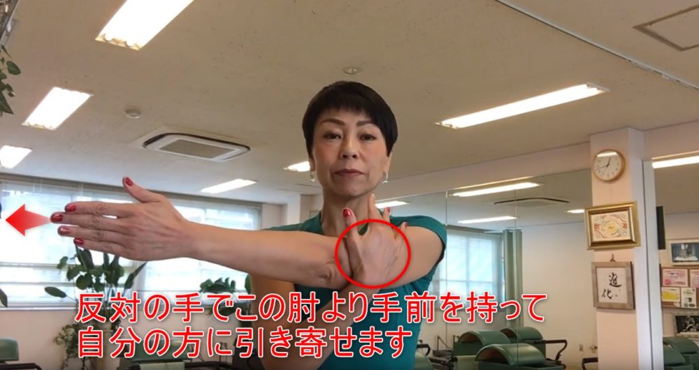 息を吸って吐きながら腕を胸の方に引き寄せる。