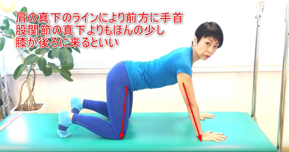肩の真下に手首、股関節の真下に膝、グループエクササイズではこうざっくり言うんですけれども厳密に言うと肩のラインにより前方に手を持ってきてください。