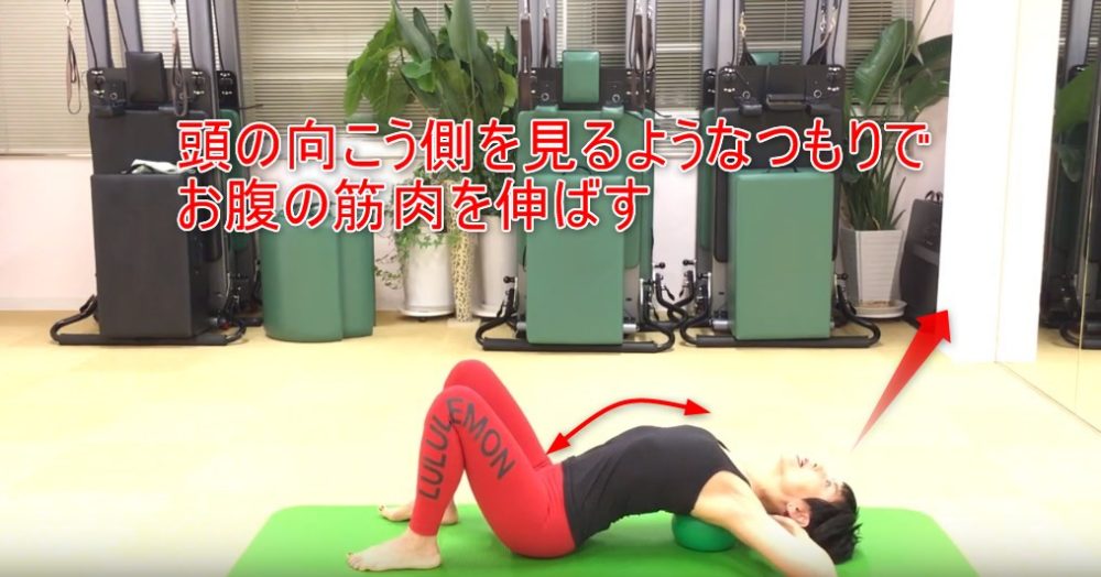 そして、頭の向こう側を見るようなつもりで、お腹の筋肉を伸ばしてください。