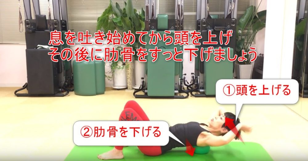 息を吐き始めてから頭を上げその後に肋骨をすっと下げてあげましょう。
