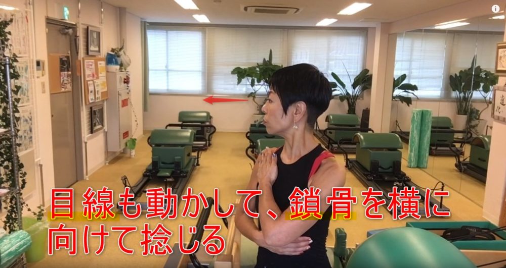 息吐きながら目線も動かして、鎖骨を横に向けるつもりで捻じります。