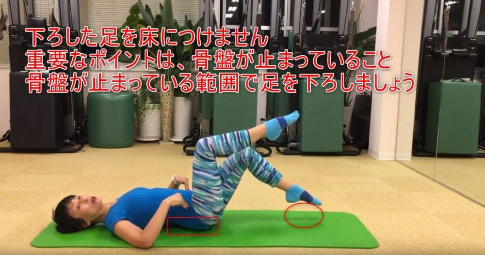 骨盤から遠ざけていく、その際に骨盤が足ついていかないように、お腹の筋肉、そして足の筋肉で止めておきます。