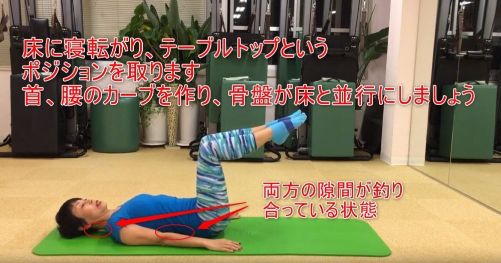 首のカーブ、腰のカーブを作り、骨盤が床と並行の状態を作ります。