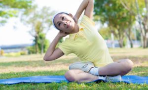 側屈の動きで、背骨や首の筋肉も一緒に伸ばされて首こり、肩こりしている人にもお勧めですよ。
