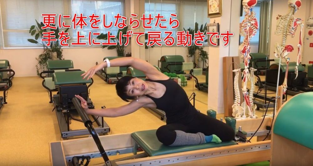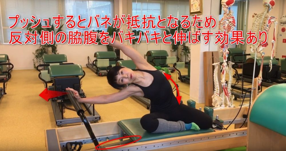 リフォーマーのバネが抵抗になって、伸びてる側の脇腹がバキバキに伸びます。